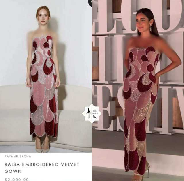 ظهرت أمينة بفستان من توقيع المصممة اللبنانية ريان بشا (Rayane Bacha)، يحمل اسم “Raisa Embroidered Velvet Gown”، صُمم من قماش المخمل المطرز يدويًا بخيوط لامعة وكريستالات دقيقة على هيئة دوائر هندسية أنيقة باللونين الوردي والقرمزي.