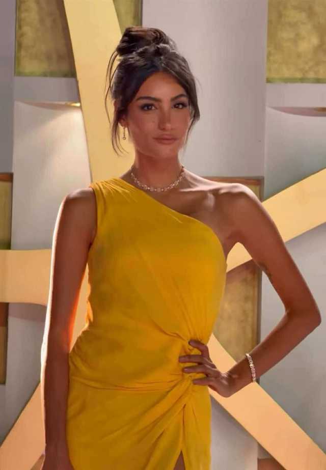 وبدت يارا عزمي بإطلالة ساحرة، مرتديه فستان طويل مجسم، اتسم الفستان بشق طويل كشف عن أحد ساقيها صمم الفستان قماش ناعم باللون الأصفر.