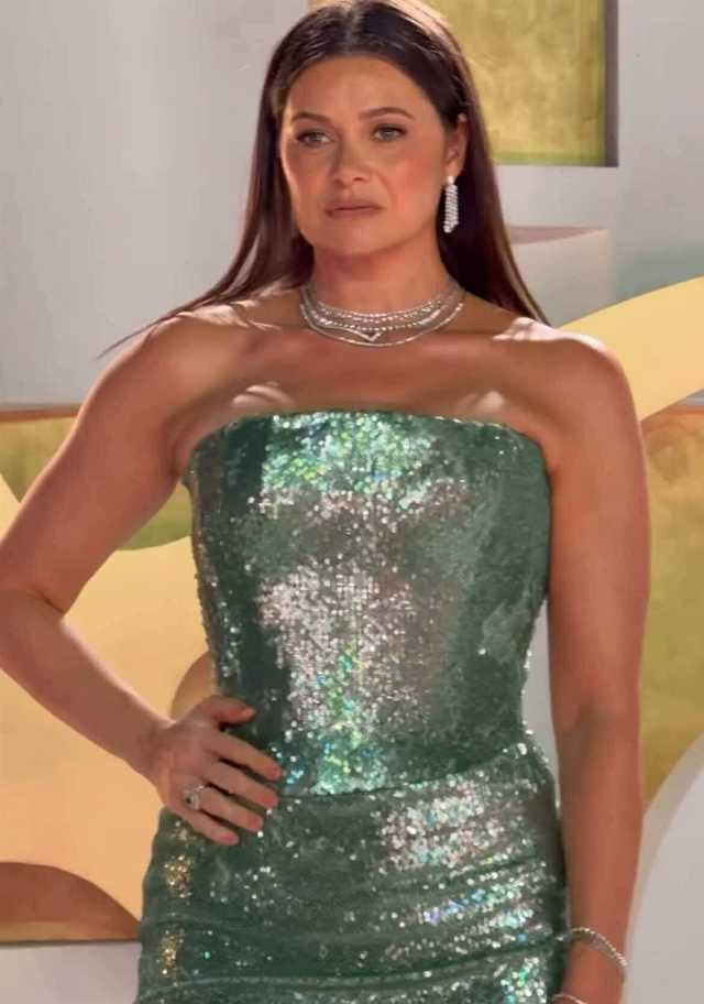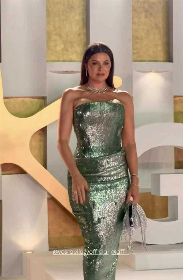 وبدت يسرا اللوزي بفستان جعلها أكثر رشاقة وجمال ، مرتدية فستان مجسم بصيحة الكب ، من قماش مصنوع بالكامل من الترتر باللون مينت جرين، وتميز بطيات ناحية الخصر، ليخفي منطقة البطن ويبرز رشاقتها.