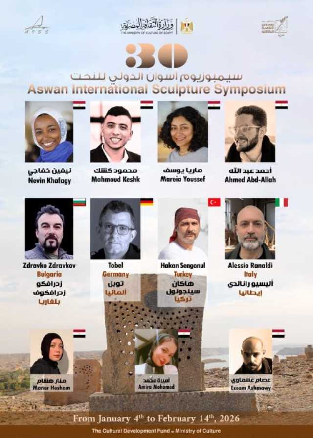 أعلنت اللجنة العليا لسيمبوزيوم أسوان الدولي للنحت عن المشاركين في الدورة الثلاثين للسيمبوزيوم، والتي تقام خلال الفترة من ٤ يناير حتى ١٤ فبراير ٢٠٢٦ بمحافظة أسوان.