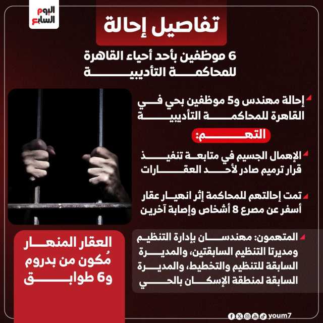 أحالت هيئة النيابة الإدارية برئاسة المستشار محمد الشناوى 6 موظفين بأحد احياء القاهرة للمحاكمة التأديبية، اليوم السابع ينشر إنفو جراف بتفاصيل الواقعة..