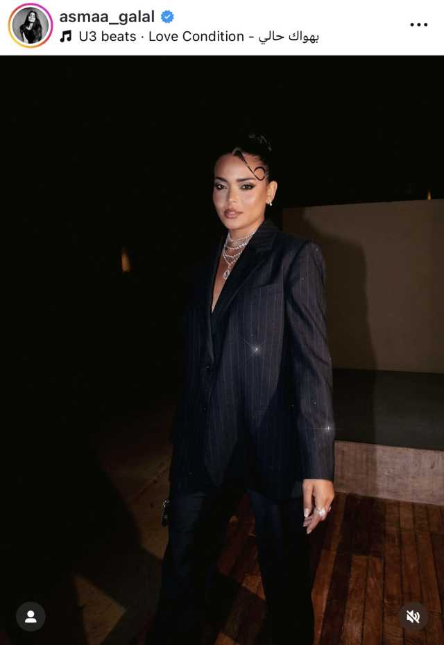 وظهرت أسماء جلال بإطلالة جذابة لافتة ، مرتدية بدلة كلاسيكية باللون الأسود ، مما حازت الصورة على إعجاب متابعيها.