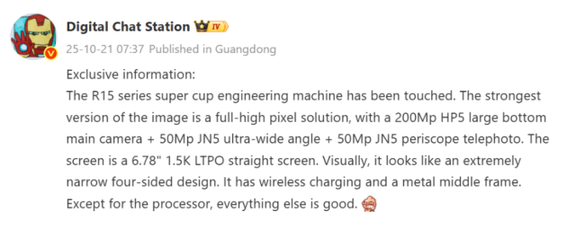 ورغم أن المُسرب لم يُحدد اسم الهاتف، يبدو أنه يُشير إلى هاتف Reno 15 Pro Max . سيحتوي إعداد الكاميرا على كاميرا رئيسية من نوع Samsung HP5 بدقة 200 ميجابكسل، بالإضافة إلى مستشعري Samsung JN5 للكاميرات فائقة الاتساع والمقربة.