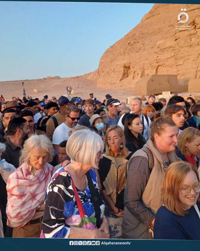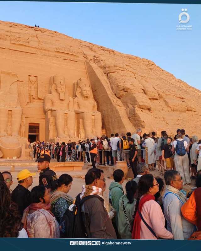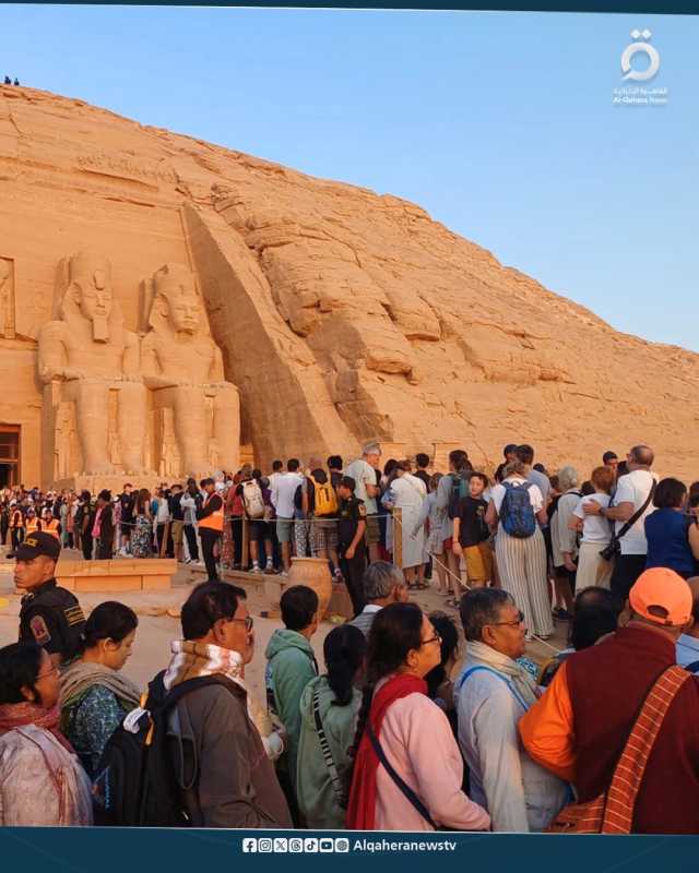 شهد معبد أبوسمبل بمصر اصطفاف آلاف السائحين فى أطول طابور سياحى لمتابعة ظاهرة تعامد الشمس على رمسيس الثاني.
