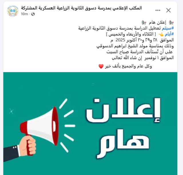 أعلنت مدرسة دسوق الثانوية الزراعية بمحافظة كفر الشيخ عبر صفحتها الرسمية على موقع التواصل الاجتماعي فيس بوك ، عن تعطيل الدراسة أيام الثلاثاء والأربعاء والخميس الموافقين ٢٨ و٢٩ و٣٠ أكتوبر 2025 م وذلك بمناسبة مولد الشيخ ابراهيم الدسوقي ، على أن تُستأنف الدراسة صباح السبت ، الموافق 1 نوفمبر .