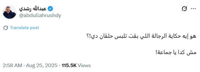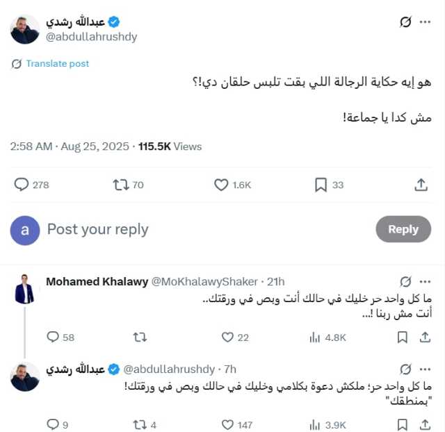 عبدالله رشدي عبر إكس: هو ايه حكاية الرجالة اللي بقت تلبس حلقان دي!؟انتقد عبدالله وشدي ارتداء بعض الرجال للحلق أخيرًا، وجاء ذلك بعد ساعات من الهجوم العنيف الذي تعرض له الفنان آسر ياسين بعد صعوده على المسرح مع ويجز في حفله الأخير في مهرجان العلمين الجديدة، وهو مرتديًا "حلق"، الأمر الذي أثار غضب وحفيظة البعض، معتبرين أن الأمر لا يتناسب مع عاداتنا وتقاليدنا.