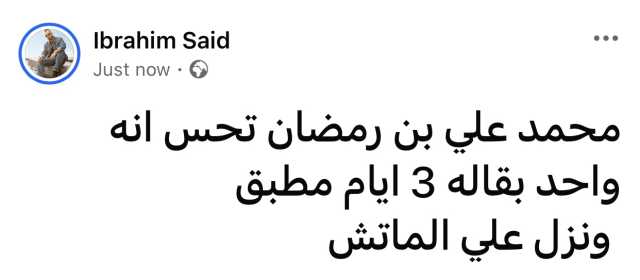 وكتب سعيد عبر حسابه الشخصي بموقع فيسبوك منشورًا: “محمد علي بن رمضان تحس إنه واحد بقاله 3 أيام مطبق ونزل على الماتش".
