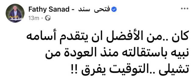 وقال سند في منشوره: “كان من الأفضل أن يتقدم أسامة نبيه باستقالته منذ العودة من تشيلي.. التوقيت يفرق!!