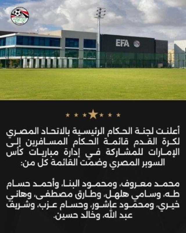 أعلنت لجنة الحكام الرئيسية بالاتحاد المصري لكرة القدم قائمة الحكام المسافرين إلى الإمارات للمشاركة في إدارة مباريات كأس السوبر المصري وضمت القائمة كل من:
