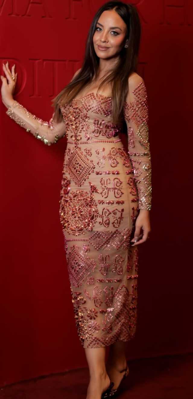 وأطلت مريم الخشت، مرتديه فستان طويل وأنيق باللون البيج والأحمر، وجاء الفستان بتصميم لافت وعصري ليكشف عن جمالها ورشاقتها.