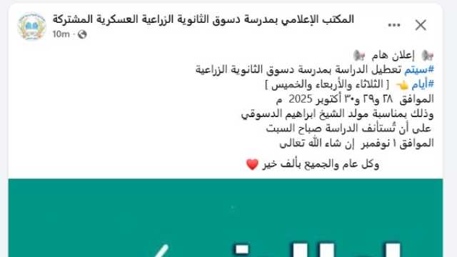 مدرسة بكفر الشيخ تعلن تعطيل الدراسة 3 أيام بسبب مولد الشيخ إبراهيم الدسوقي