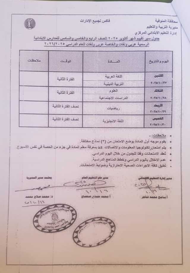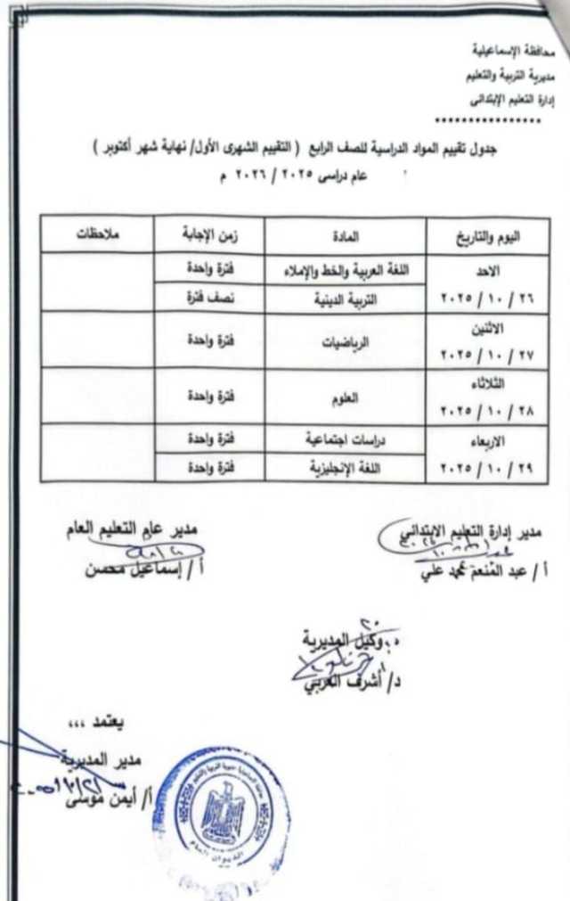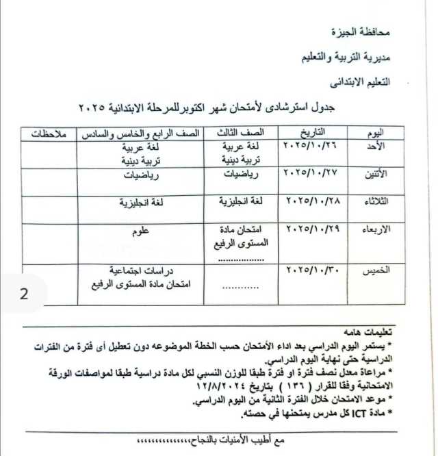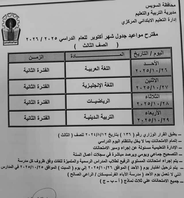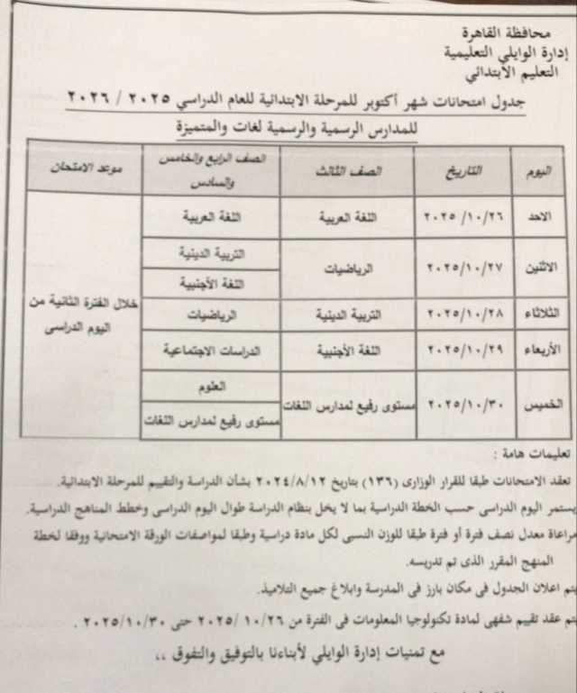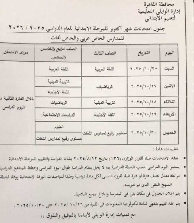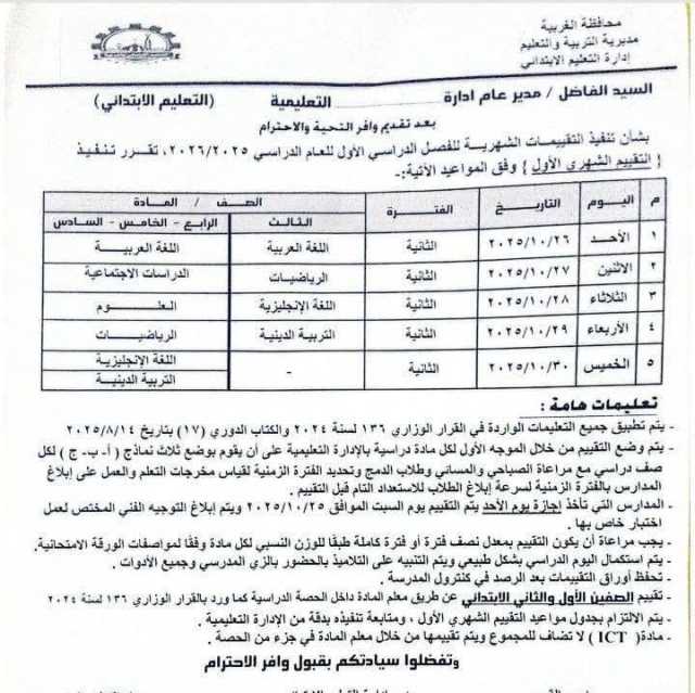 وسوف يؤدي التلاميذ الامتحان في حصة دراسية لكل صف دراسي خلال اليوم الدراسي ، وتحفظ أوراق الإجابة في كنترول المدرسة بعد الانتهاء من اعمال التصحيح ، كما سيتم الامتحان خلال اليوم الدراسي و يتم استكمال باقي اليوم الدراسي بشكل طبيعي، وسيتم تقييم الصفين الأول والثاني الابتدائي عن طريق معلم المادة