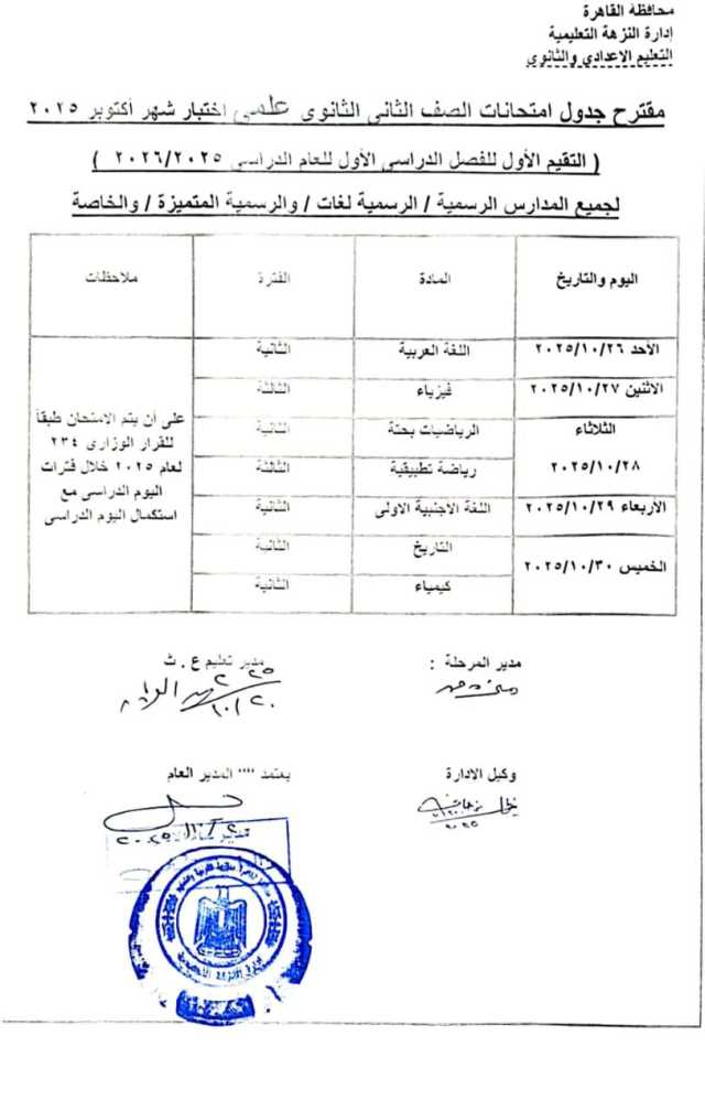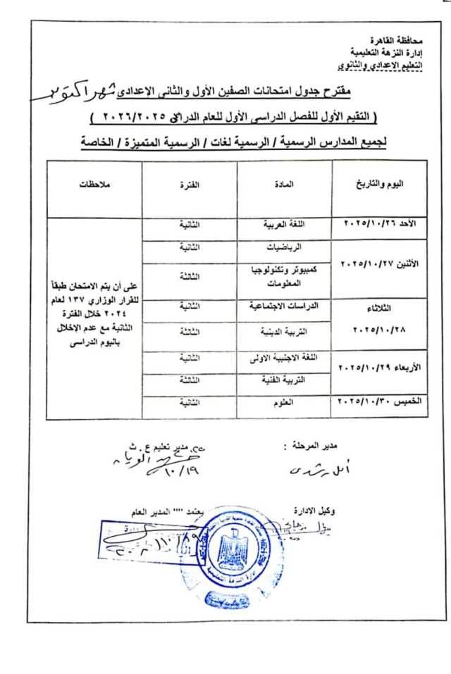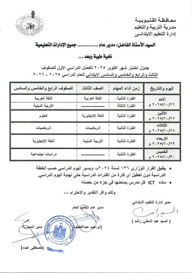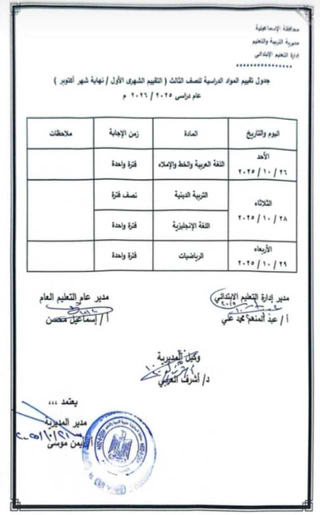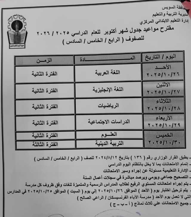 وسوف يؤدي التلاميذ الامتحان في حصة دراسية لكل صف دراسي خلال اليوم الدراسي ، وتحفظ أوراق الإجابة في كنترول المدرسة بعد الانتهاء من اعمال التصحيح ، كما سيتم الامتحان خلال اليوم الدراسي و يتم استكمال باقي اليوم الدراسي بشكل طبيعي، وسيتم تقييم الصفين الأول والثاني الابتدائي عن طريق معلم المادة