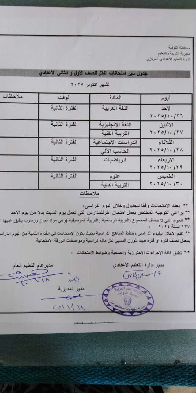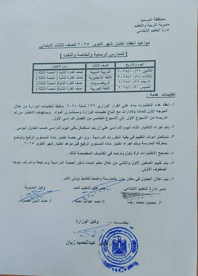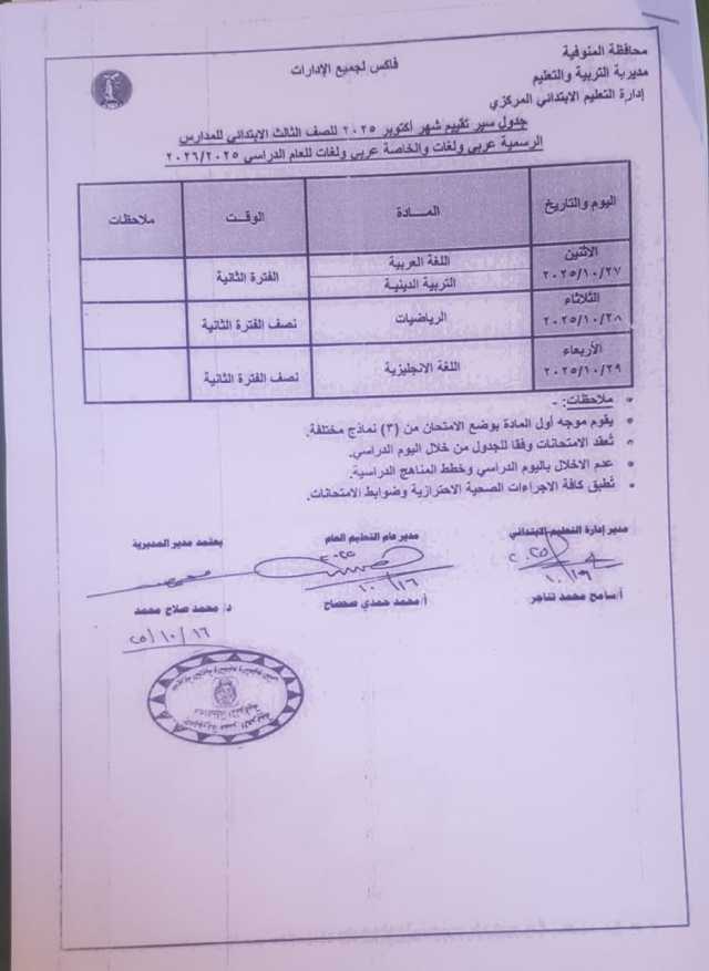 وخلال امتحانات شهر أكتوبر 2025 ، من المقرر أن تقوم كل مدرسة بإعداد 3 نماذج امتحانية لكل مادة وارسالها للتوجيه المختص بالإدارة التعليمية لمراجعتها والتأكد من مطابقتها بالمواصفات والمحتوى المقرر ثم يتم إعادة توزيعها على المدارس ويتم تبديل النماذج بين المدارس حرصا على الموضوعية