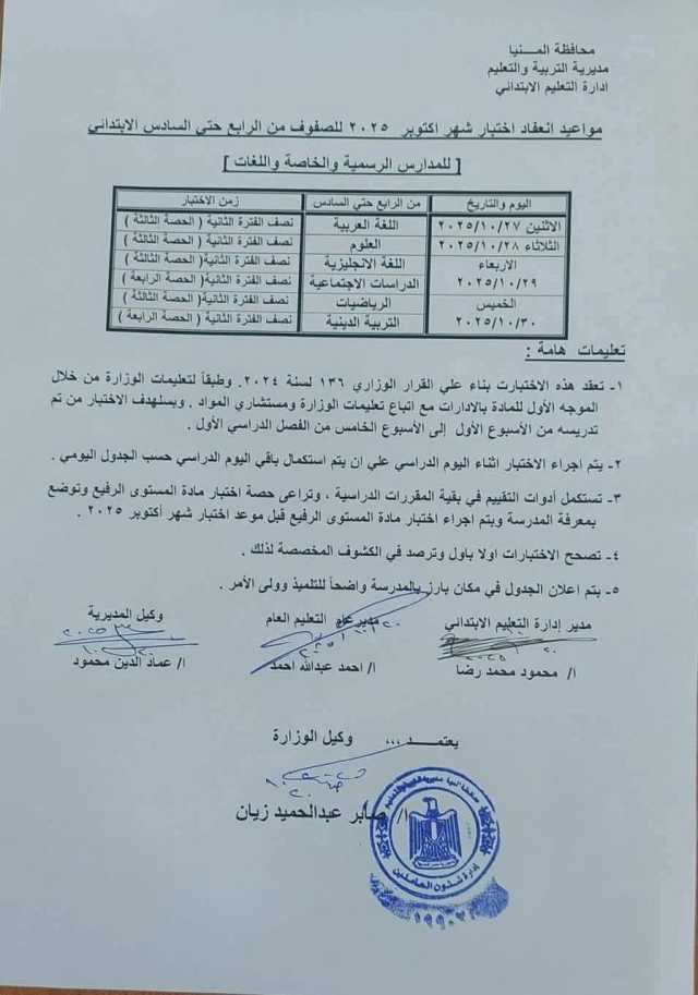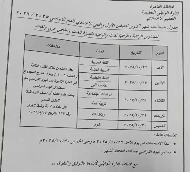 فمن المقرر رسميا انطلاق امتحانات شهر أكتوبر 2025 في جميع المحافظات ، يوم الأحد القادم ، وذلك تنفيذا لتعليمات وزارة التربية والتعليم التي وجهت بعقد امتحانات شهر أكتوبر 2025 من 26 أكتوبر 2025 حتى 30 أكتوبر 2025