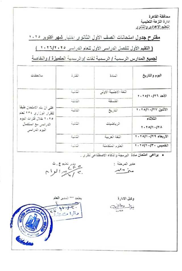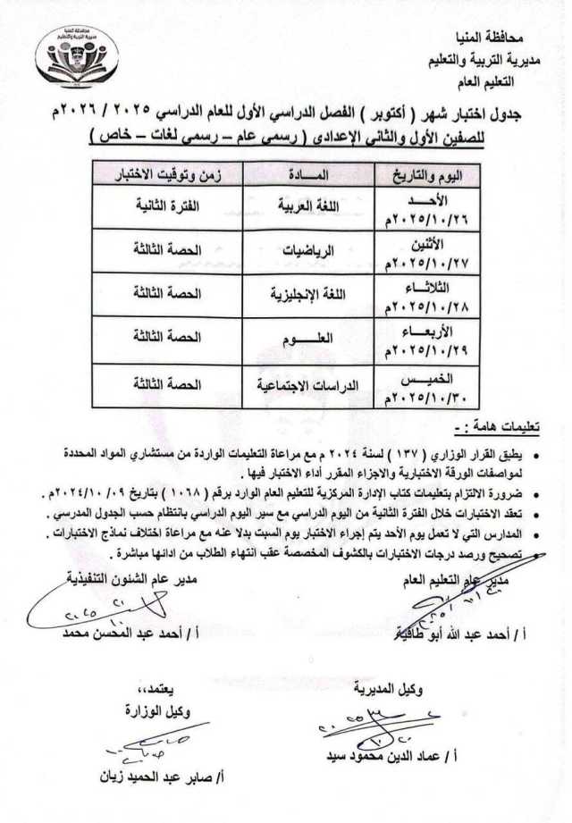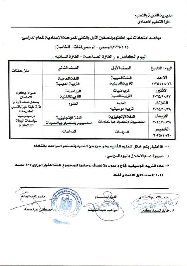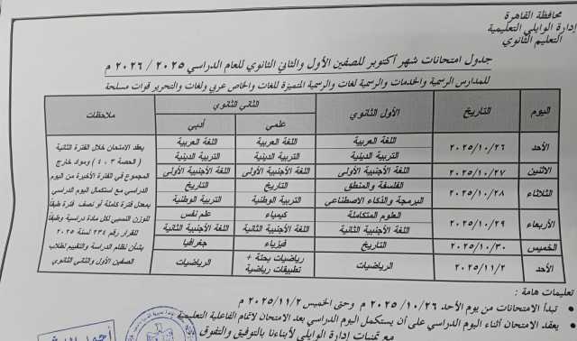 وأصدرت وزارة التربية والتعليم والتعليم الفني ، قرارا عاجلا بشأن امتحانات شهر أكتوبر 2025 للصفين الأول الثانوي “عام و بكالوريا ” والثاني الثانوي.