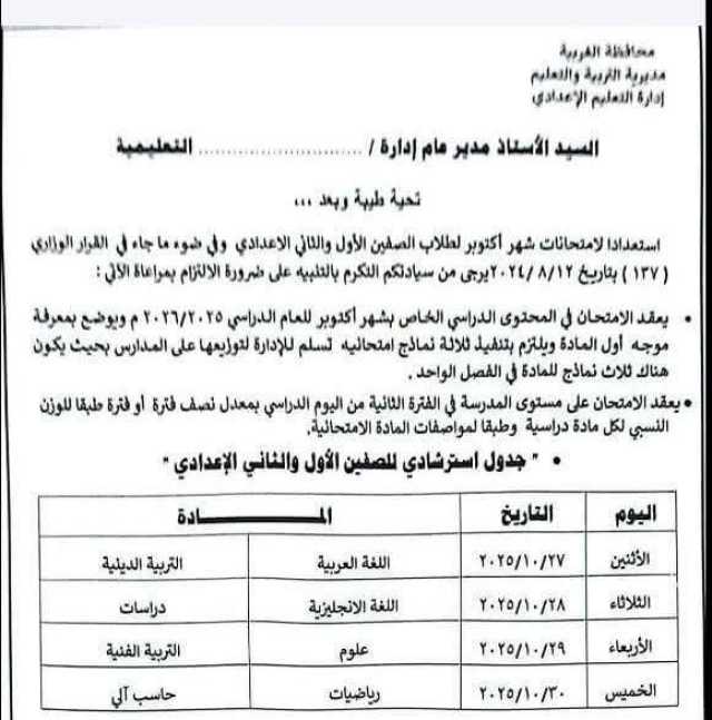 يستعد طلاب المدارس لبدء امتحانات شهر أكتوبر 2025 الأسبوع القادم ، وفقا للجداول المعلنة من المديريات والإدارات التعليمية والمدارس .
