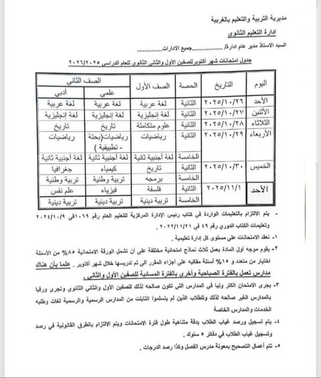 حيث سيشهد كل فصل في كل امتحان من امتحانات شهر أكتوبر 2025 ، توزيع 3 نماذج امتحانية للمادة الواحدة