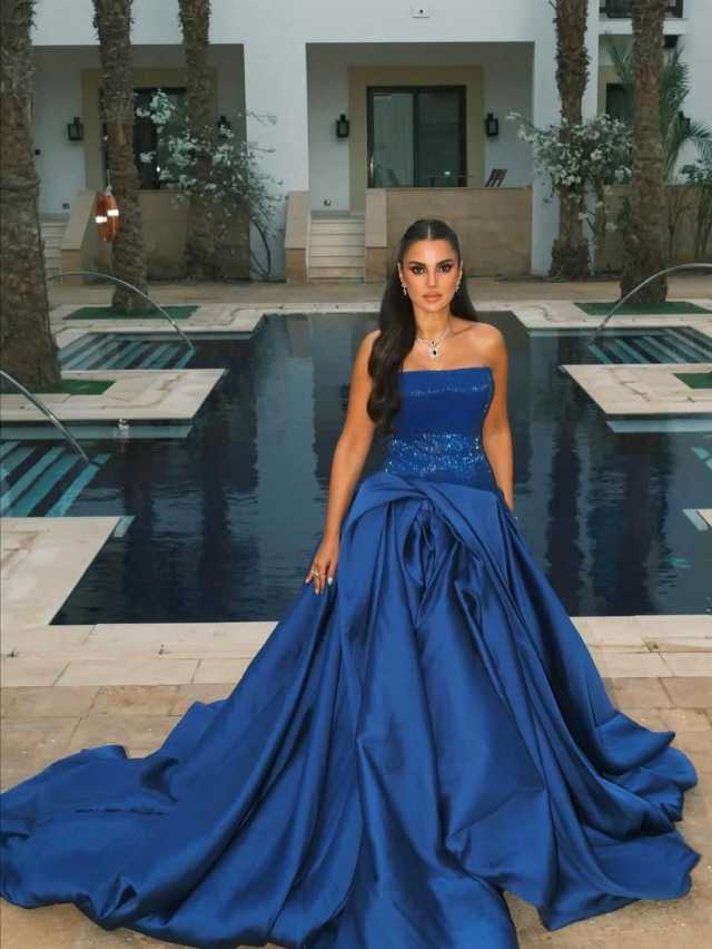 وفي إطلالة أخرى، اختارت درة فستاناً أزرق داكناً بدون أكمام أضفى عليها لمسة من الفخامة الهادئة، ونسقته مع مجوهرات مرصعة بالألماس والياقوت، لتكمل إطلالتها الملكية بتسريحة ذيل حصان ومكياج برونزي ناعم أبرز ملامحها.