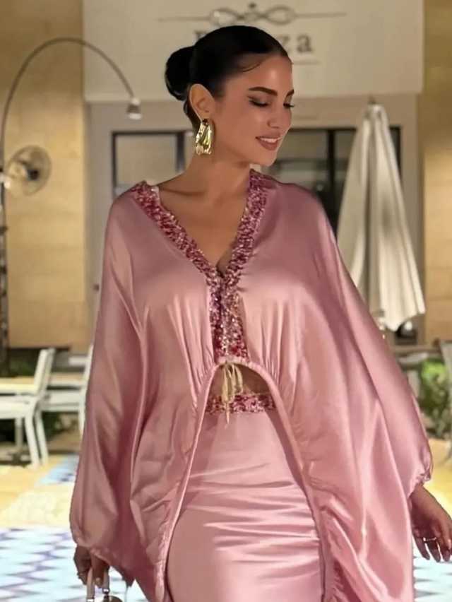 وتألقت ندى أكرم بفستان كب مثبت عند العنق، مكشوف ناحية البطن، مع تطريزات ذهبية ناحية الخصر ؛ ليبرز رشاقتها وقوامها الممشوق.