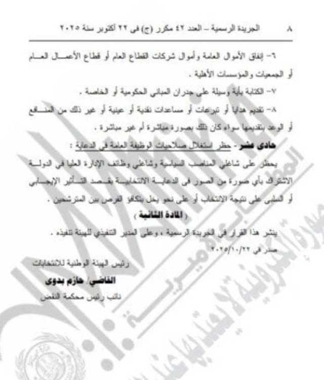 نشرت الجريدة الرسمية قرار الهيئة الوطنية للانتخابات، برئاسة القاضي حازم بدوي ضوابط الدعاية الانتخابية في انتخابات مجلس النواب، ومحظورات الدعاية، والتي جاءت كالتالي: