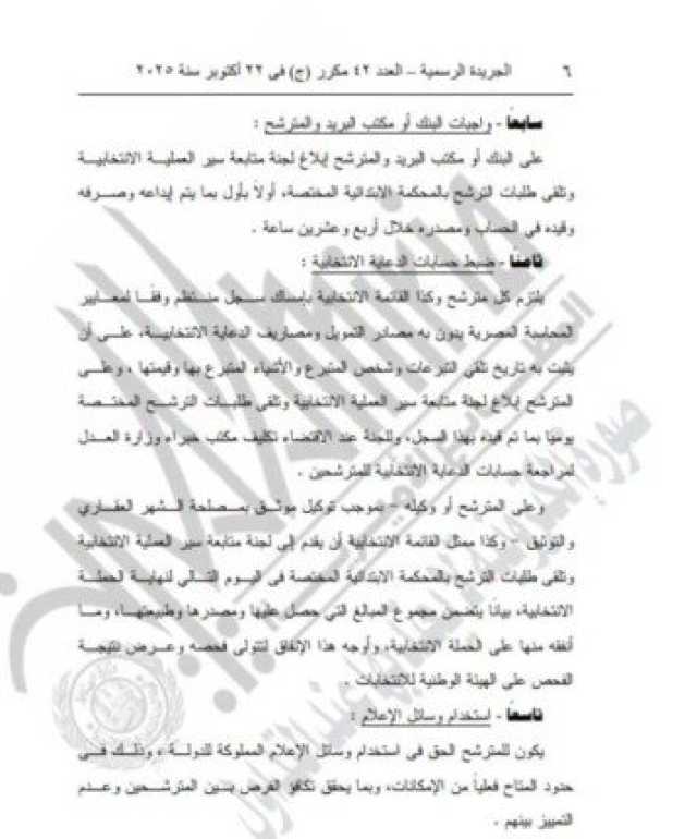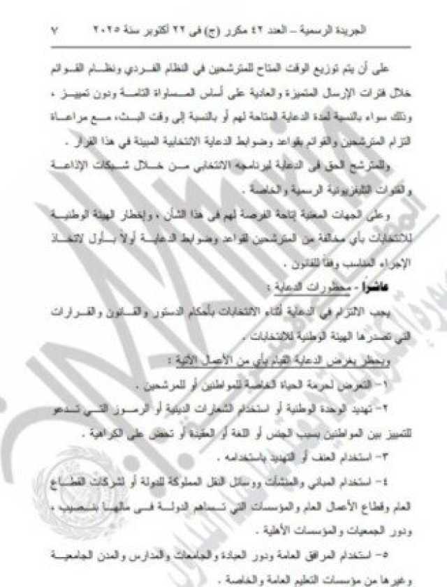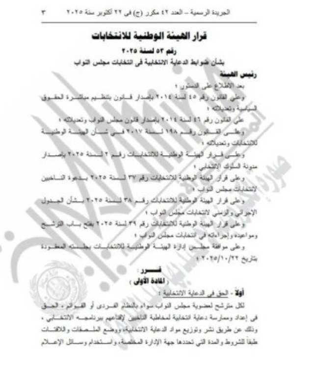 وتضمن القرار رقم 53 لسنة 2025 أن لكل مترشح الحق في إعداد وممارسة دعاية انتخابية لمخاطبة الناخبين لإقناعهم ببرنامجه الانتخابي، وذلك عن طريق نشر وتوزيع مواد الدعاية الانتخابية، ووضع الملصقات واللافتات طبقًا للشروط والمدة التي تحددها جهة الإدارة المختصة، واستخدام وسائل الإعلام المسموعة والمرئية والمطبوعة والإلكترونية، وغيرها من الأنشطة، وذلك بحرية تامة بكل الطرق التي يجيزها القانون وفي إطار الضوابط والقواعد الواردة فى الدستور والقانون وقرارات الهيئة الوطنية للانتخابات في هذا الشأن.
