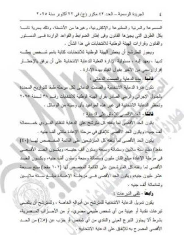 ثالثا: الحد الأقصى للإنفاق على الدعاية:يكون الحد الأقصى لما ينفقه كل مترشح على الدعاية للنظام الفردي خمسمائة ألف جنيه، ويكون الحد الأقصى للإنفاق في مرحلة الإعادة مائتي ألف جنيه.