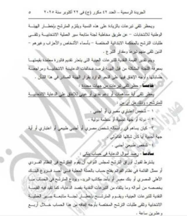 خامسا: حظر تلقى تبرعات من جهات محددة:يحظر تلقي أية مساهمات أو دعم نقدي أو عيني للإنفاق على الدعاية الانتخابية للمترشح، وذلك من أي من: