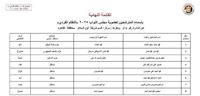 أعلنت الهيئة الوطنية للانتخابات، اليوم الخميس الموافق 23 أكتوبر 2025، عن القائمة النهائية لمرشحي النظام الفردي في دوائر محافظة القاهرة، وذلك لخوض انتخابات مجلس النواب المقرر إجراؤها في نوفمبر المقبل.