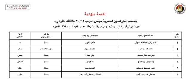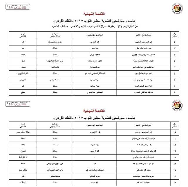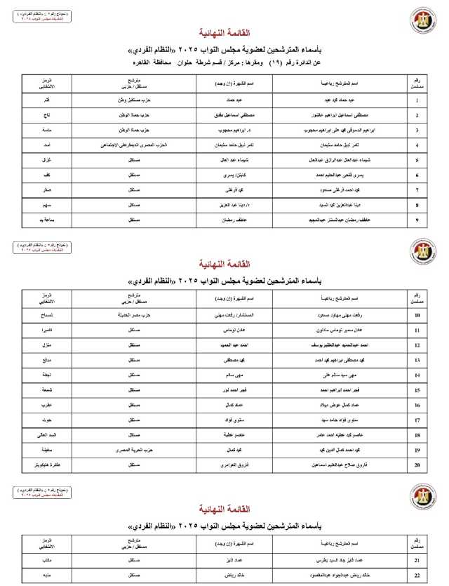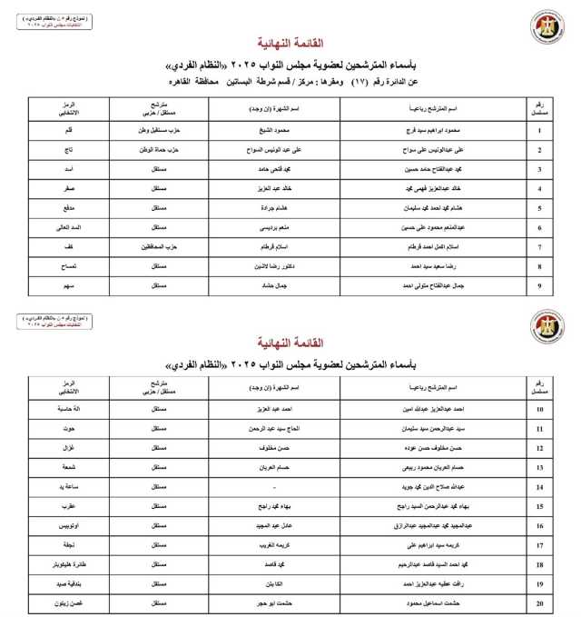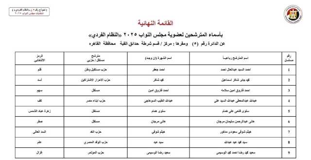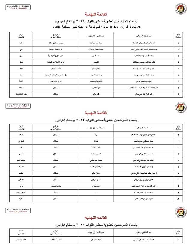 الوطنية للانتخابات تعلن القائمة النهائية لمرشحي النواب في دوائر القاهرة عن النظام الفردي