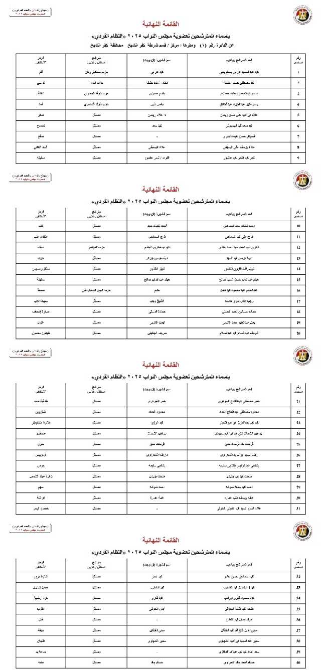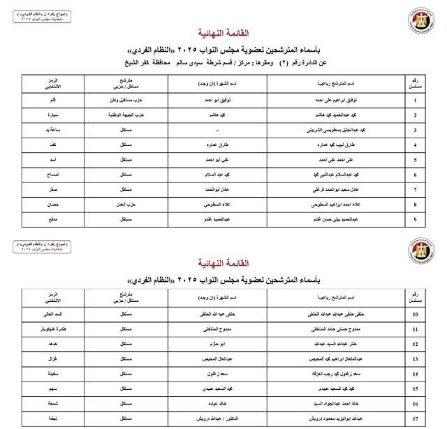 أكدت الهيئة الوطنية للانتخابات اليوم، الخميس الموافق 23 أكتوبر 2025، اعتماد القائمة النهائية للمرشحين الذين سيخوضون انتخابات مجلس النواب 2025 عن النظام الفردي في دوائر محافظة كفر الشيخ.