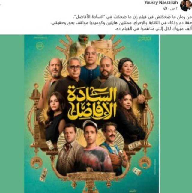 ووجه يسري نصرالله، عبر حسابه الرسمي بموقع التواصل الاجتماعي «فيسبوك» رسالة لصناع فيلم «السادة الأفاضل»، قائلا: «من زمان ما ضحكتش في فيلم زي ما ضحكت في السادة الأفاضل، خفة دم وذكاء في الكتابة والإخراج.