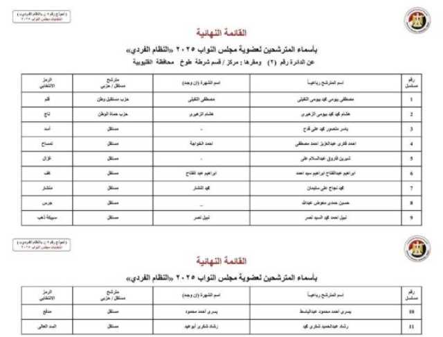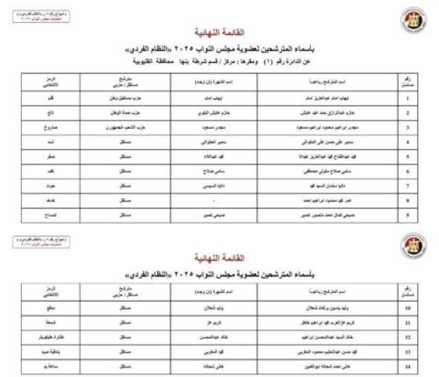القائمة النهائية لمرشحي دوائر القليوبية عن النظام الفردي في انتخابات مجلس النواب 2025