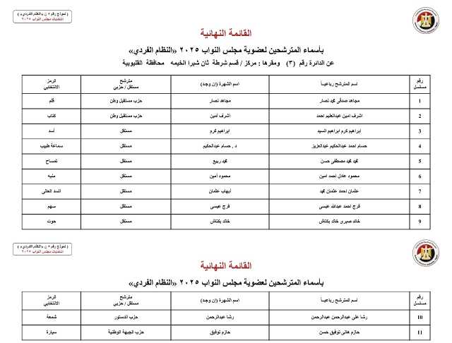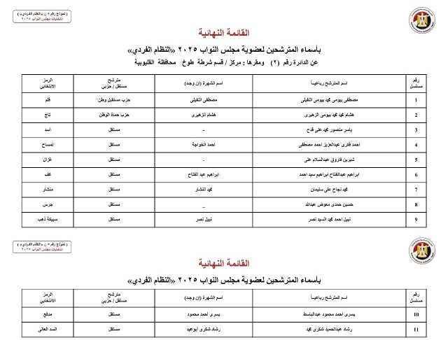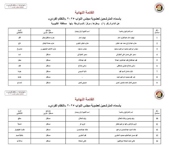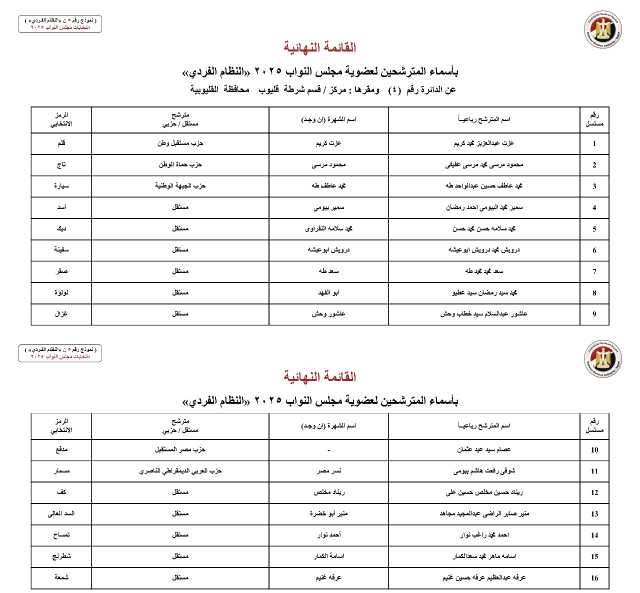 القائمة النهائية لمترشحي دوائر محافظة القليوبية عن النظام الفردي