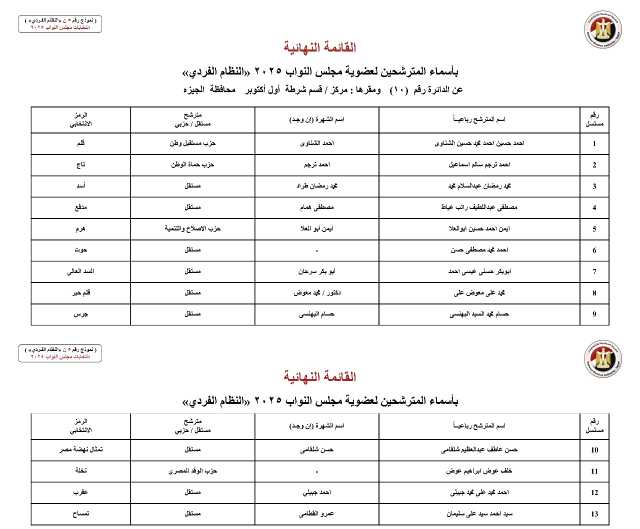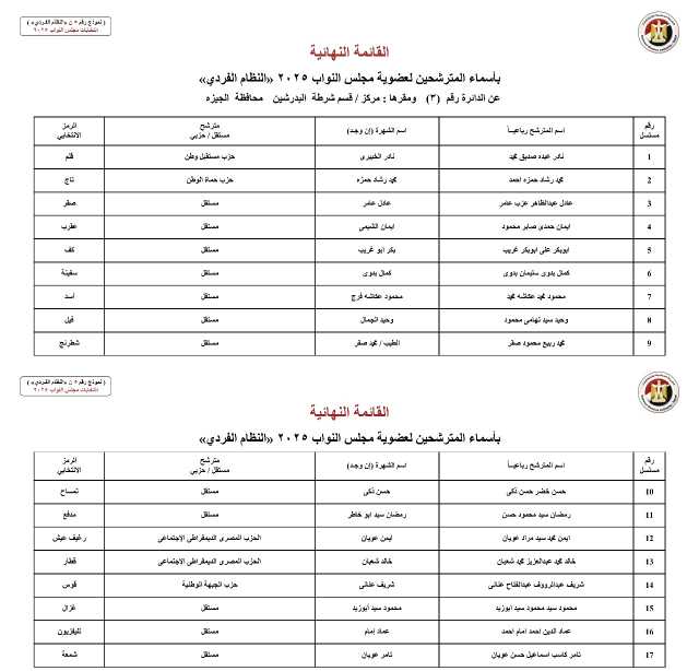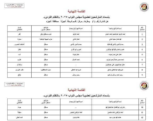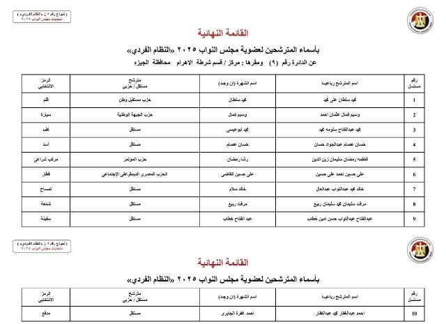 ننشر القائمة النهائية لمترشحي دوائر محافظة الجيزة عن النظام الفردي