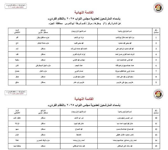 حصل "صدى البلد" على القائمة النهائية لمرشحي دوائر محافظة الجيزة عن النظام الفردي لانتخابات مجلس النواب.
