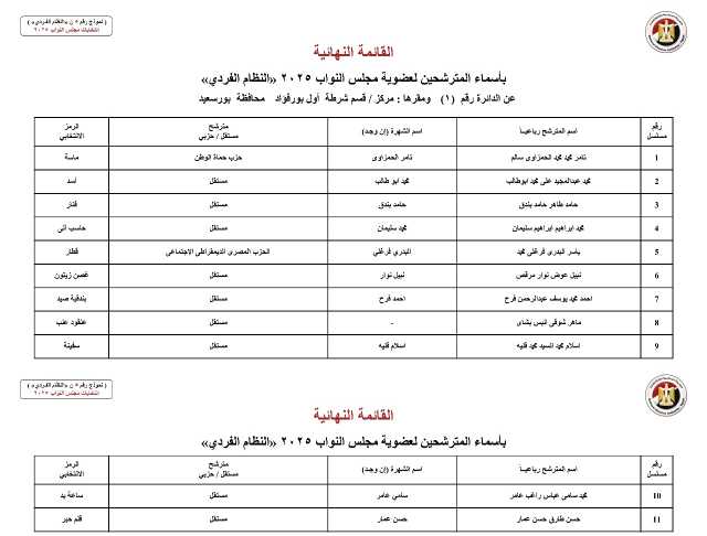 القائمة النهائية لمترشحي دوائر محافظة بورسعيد عن النظام الفردي