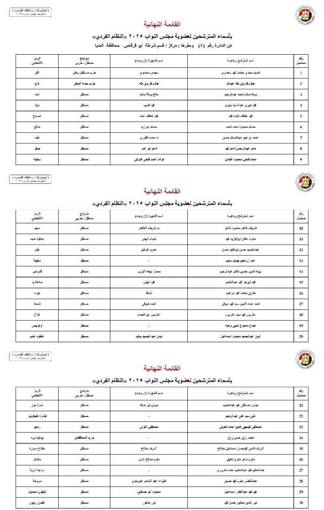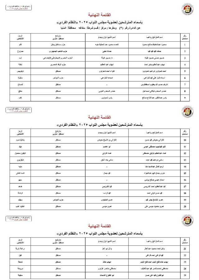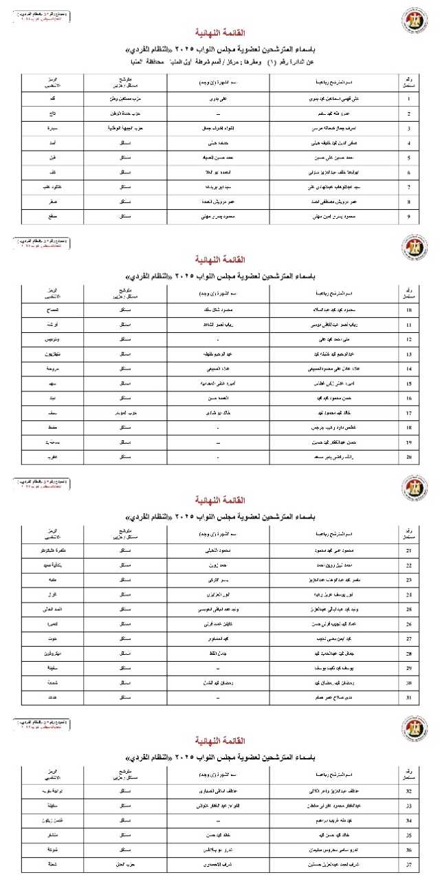 الهيئة الوطنية للانتخابات تُصدر القائمة النهائية لمرشحي "فردي" النواب بالمنيا