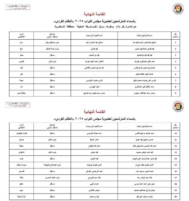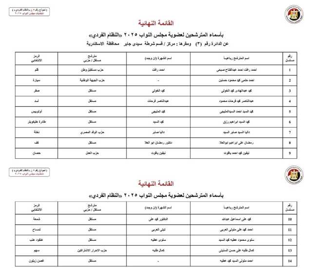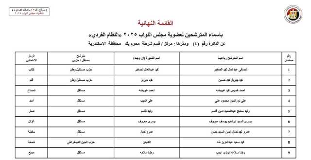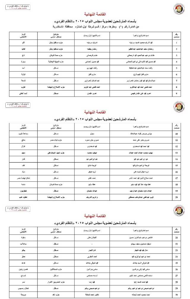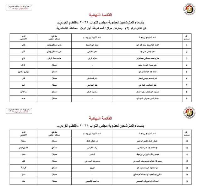 أعلنت الهيئة الوطنية للانتخابات بشكل عاجل، اليوم الخميس الموافق 23 أكتوبر 2025، القائمة النهائية لمرشحي النظام الفردي في جميع دوائر محافظة الإسكندرية.
