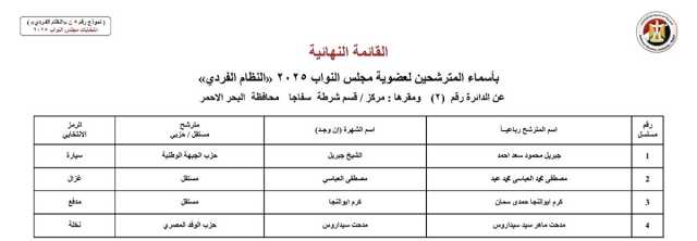 أعلنت الهيئة الوطنية للانتخابات اليوم، الخميس الموافق 23 أكتوبر 2025، عن القائمة النهائية والمعتمدة للمرشحين بالنظام الفردي الذين سيخوضون انتخابات مجلس النواب 2025 في دوائر محافظة البحر الأحمر.