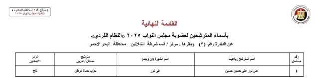 ويأتي هذا الإعلان عقب استيفاء المراجعات القانونية والانتهاء من النظر في الطعون. وتضم القائمة الأسماء التي ستخوض المنافسة الانتخابية النهائية على مقاعد المحافظة الساحلية في مجلس النواب 2025.