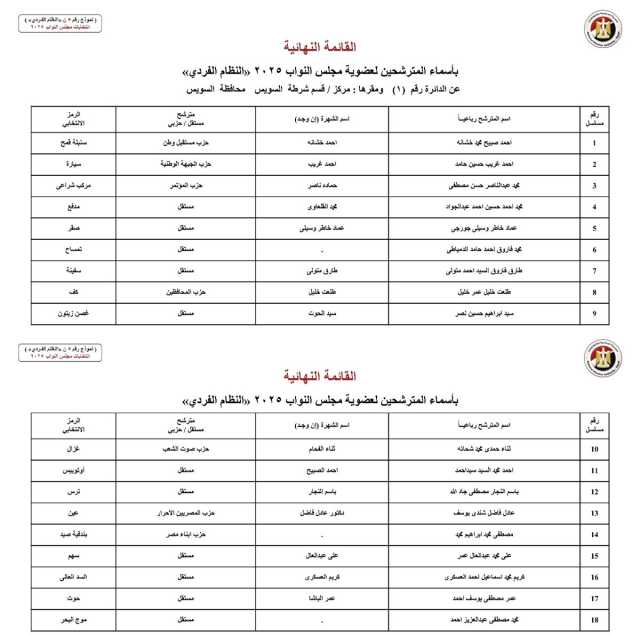 أصدرت الهيئة الوطنية للانتخابات اليوم، الخميس الموافق 23 أكتوبر 2025، الإشارة النهائية لانطلاق المنافسة البرلمانية في محافظة السويس، وذلك بإعلانها القائمة المعتمدة والنهائية لمرشحي النظام الفردي على مقاعد مجلس النواب.