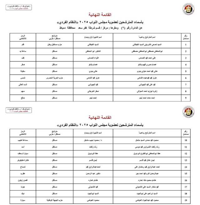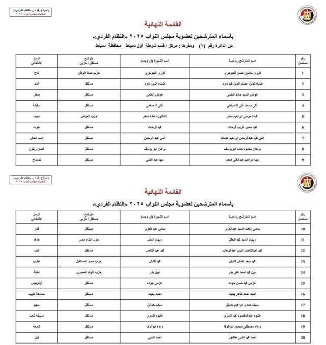 أصدرت الهيئة الوطنية للانتخابات اليوم، الخميس الموافق 23 أكتوبر 2025، القائمة النهائية والمعتمدة للمرشحين بالنظام الفردي الذين سيشاركون في انتخابات مجلس النواب 2025 بدوائر محافظة دمياط.