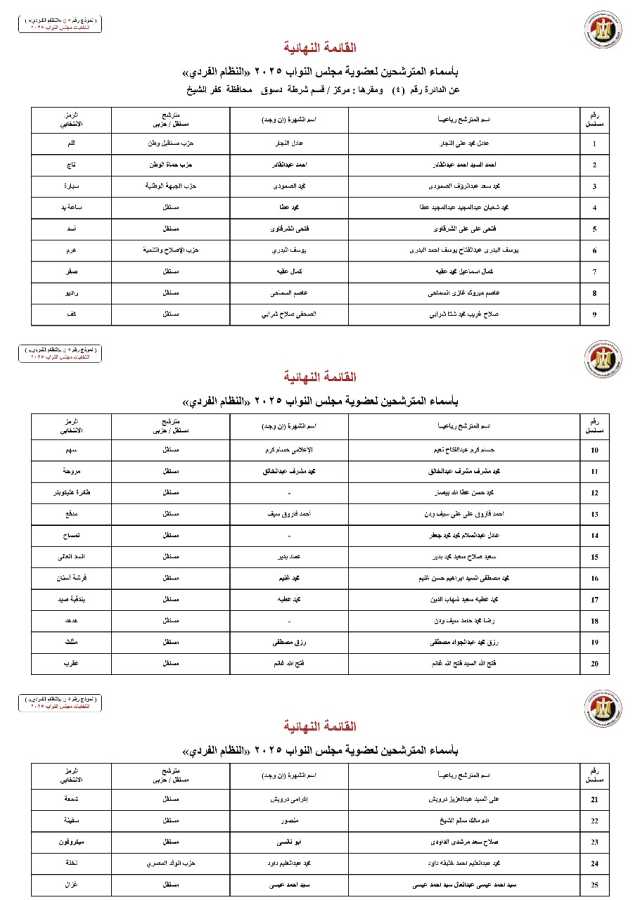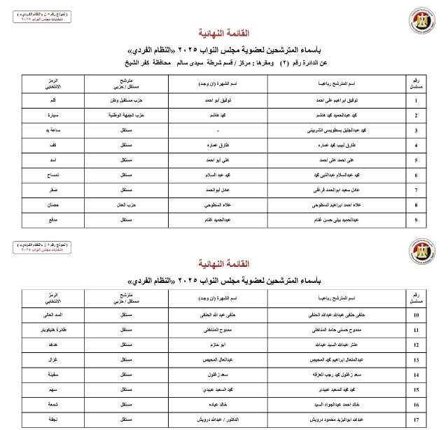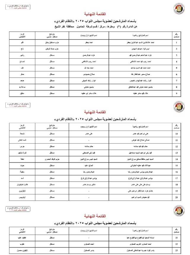 ننشر القائمة النهائية لمترشحي دوائر محافظة كفر الشيخ عن النظام الفردي