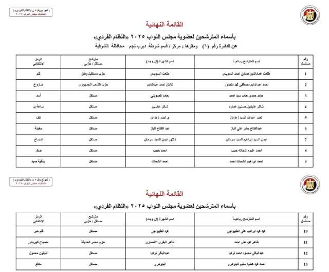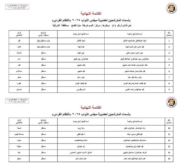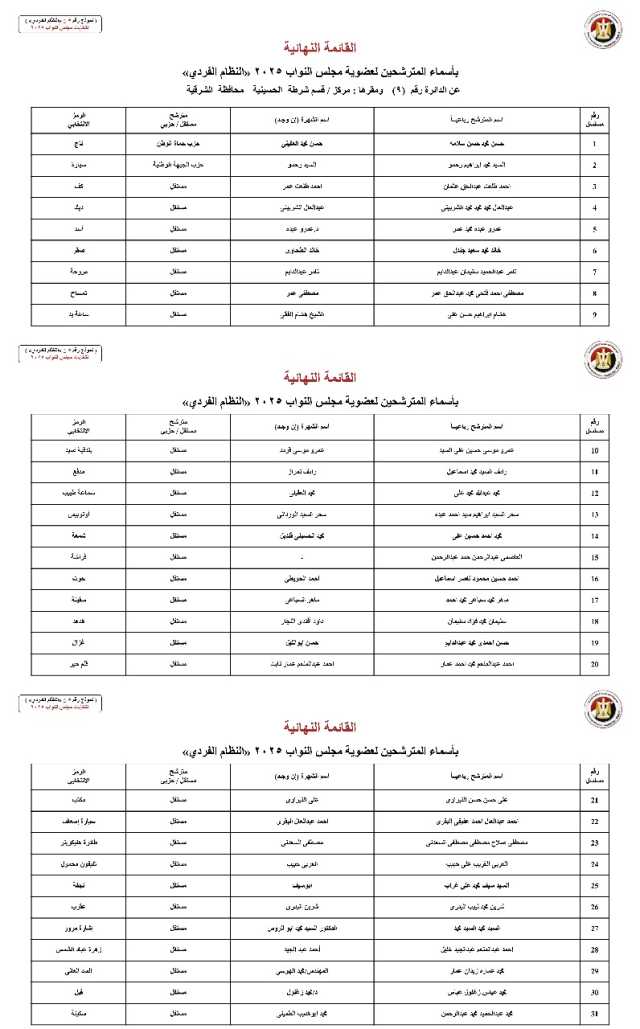 الوطنية للانتخابات تُصدر القائمة النهائية لمرشحي "فردي" النواب بالشرقية