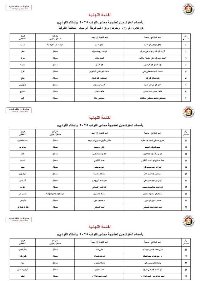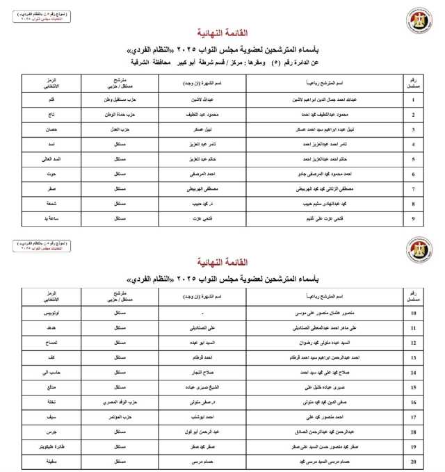 أعلنت الهيئة الوطنية للانتخابات اليوم، الخميس الموافق 23 أكتوبر 2025، عن القائمة النهائية والرسمية للمرشحين بالنظام الفردي في جميع دوائر محافظة الشرقية، استعداداً لانتخابات مجلس النواب 2025.
