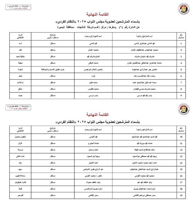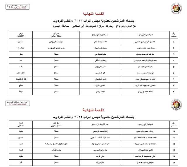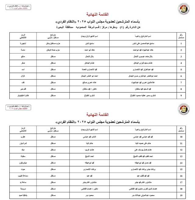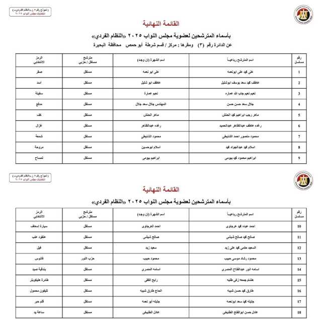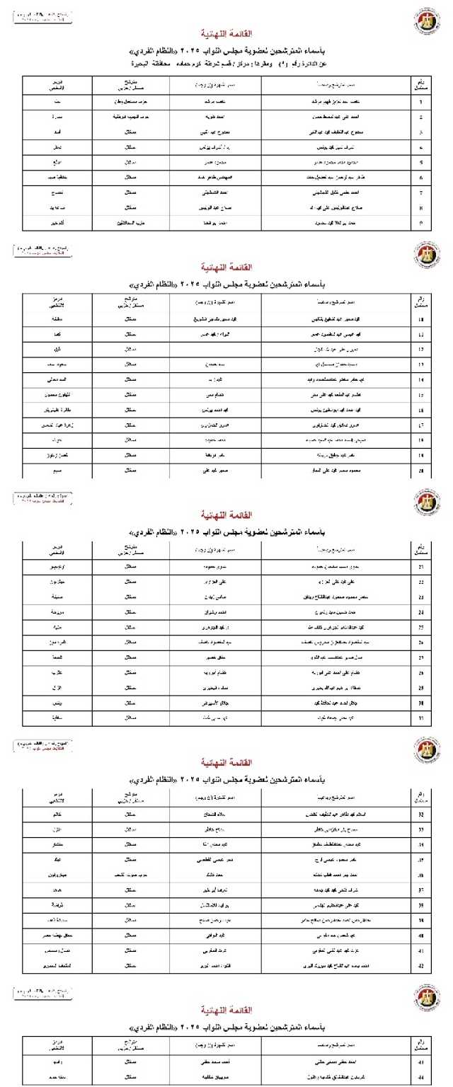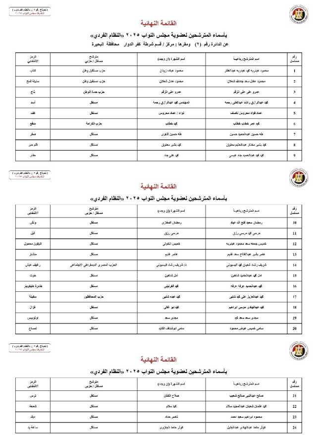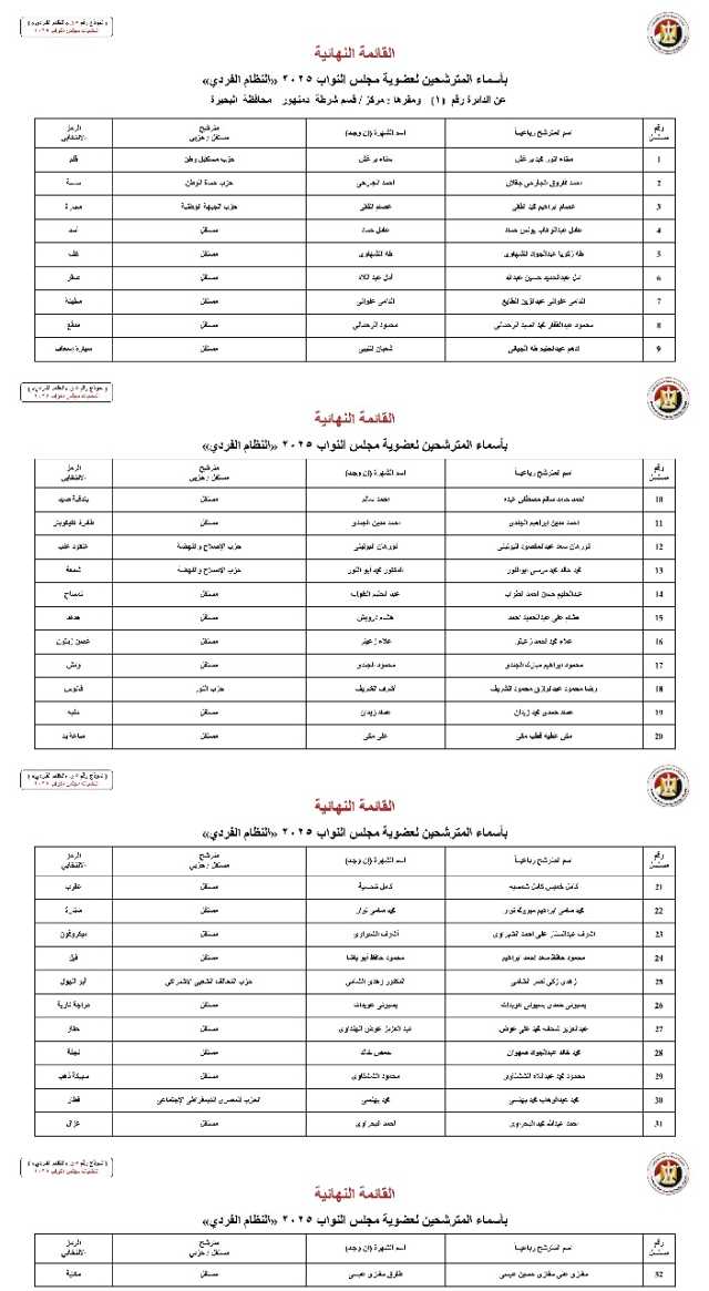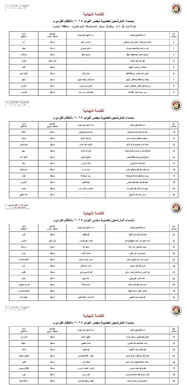 أصدرت الهيئة الوطنية للانتخابات اليوم، الخميس الموافق 23 أكتوبر 2025، القائمة النهائية والمعتمدة للمرشحين بالنظام الفردي على مقاعد مجلس النواب في دوائر محافظة البحيرة.