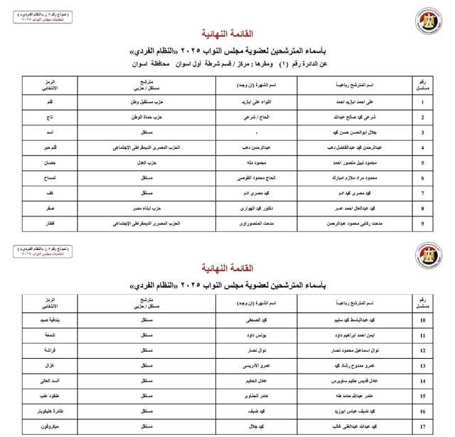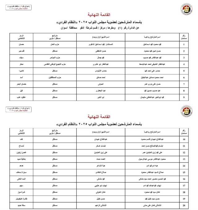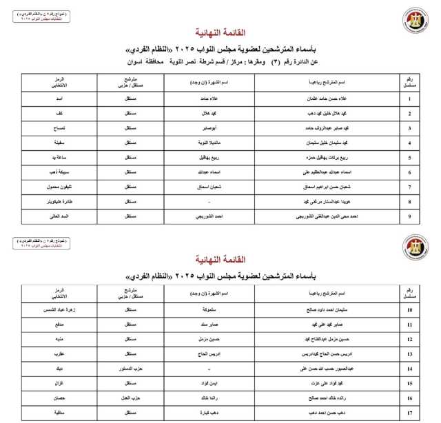 أعلنت الهيئة الوطنية للانتخابات، قبل قليل اليوم الخميس الموافق 23 أكتوبر 2025، عن القائمة النهائية والرسمية للمرشحين بالنظام الفردي الذين سيخوضون انتخابات مجلس النواب 2025 في دوائر محافظة أسوان.