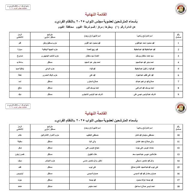 ننشر القائمة النهائية لمترشحي دوائر الفيوم عن النظام الفردي