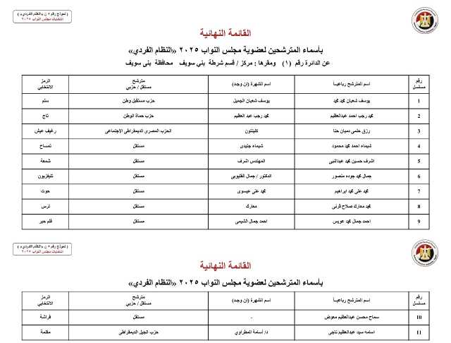 ننشر القائمة النهائية لمترشحي دوائر محافظة بني سويف عن النظام الفردي